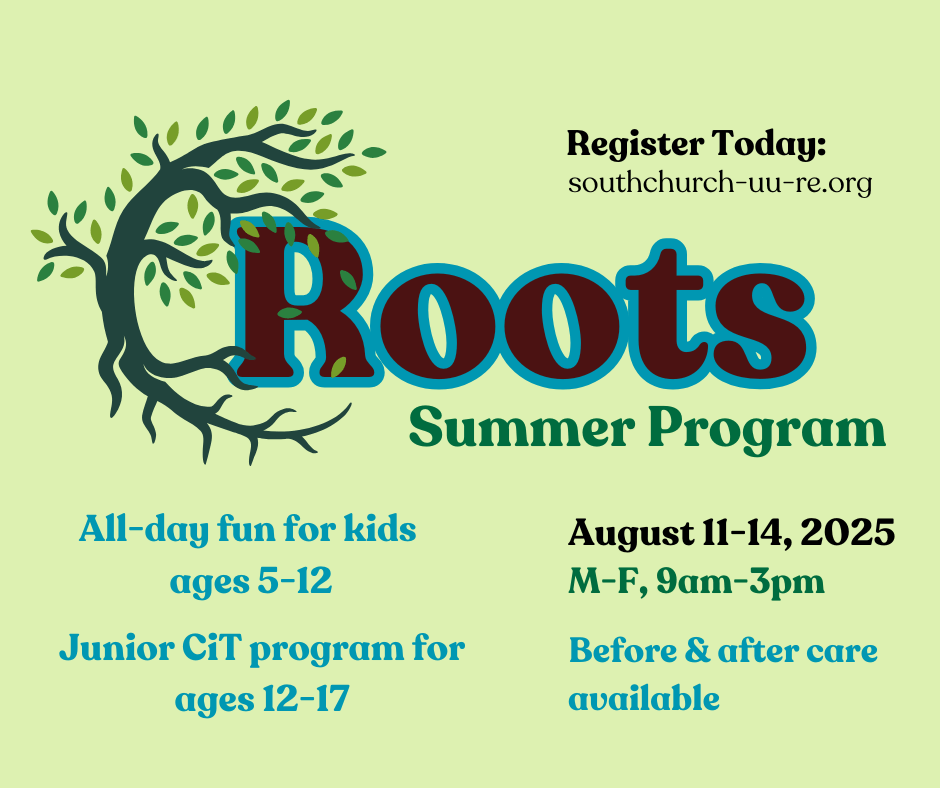 Registration is now open for Roots Summer Program! This is a weeklong adventure for kids ages 5 and up, which centers community and connection through play, exploration, and service. There is a Counselor-In-Training option for kids 12-17. Registration is open to the wider community and scholarships are available. Space is limited! For more info and to register: https://southchurch-uu-re.org/roots-summer-program/