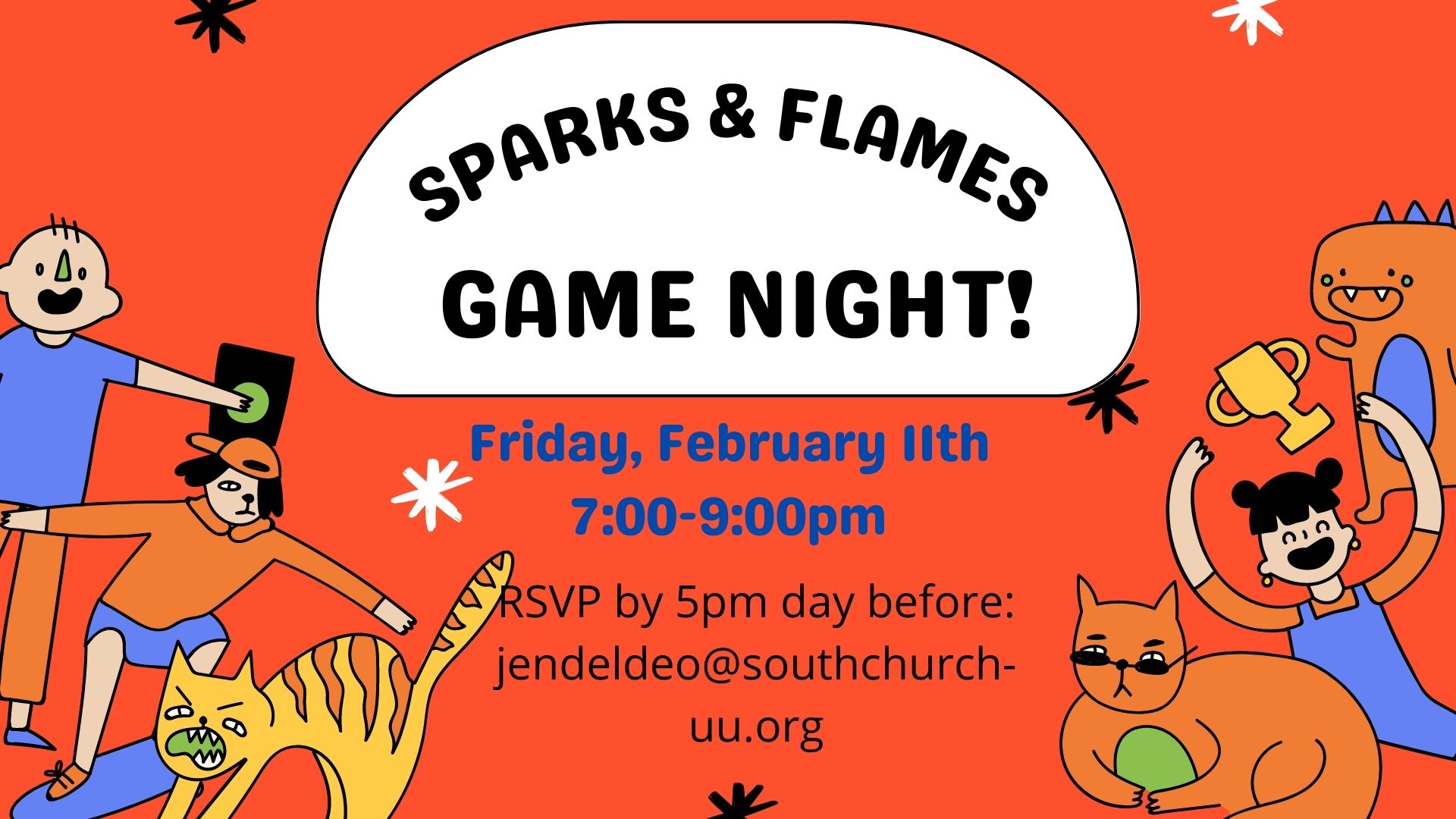 Sparks and Flames social group for grades 5 through 8: Games at church! 7:00-8:30p RSVP: jendeldeo@southchurch-uu.org