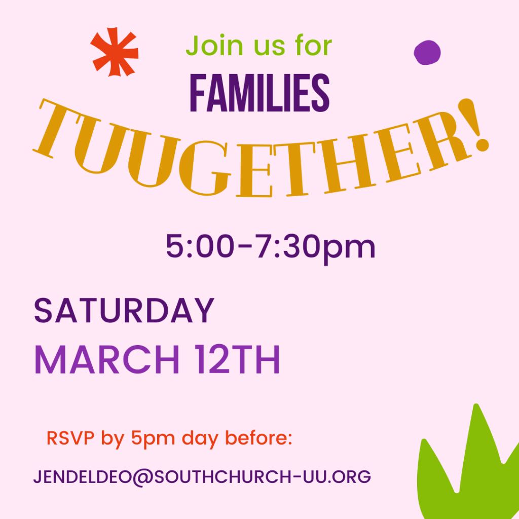 Families Tuugether 5:00-7:30pm! Free date night for parents and social time for kids. Parents will connect together briefly over a conversation and then are free to spend time out however you’d like. Kids bring their dinner (or eat beforehand) and play with friends. RSVP by 5pm the day before: jendeldeo@southchurch-uu.org