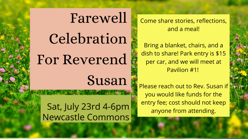 This is a big transition, and big transitions often come with many kinds of emotions. There is a lot of excitement, nervousness, joy, etc for welcoming Reverend Ellen; and sorrow, nervousness, etc for saying farewell to our dear Reverend Susan. Please join in the ways that as a community we will be intentional in processing and moving forward with the transitions in lovely ways.
