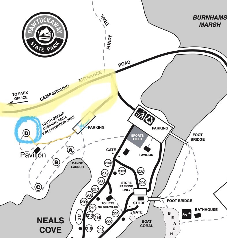 Navigation aids direct people to the park in different ways. Exit 5 off of route 101 is the way into the right entrance. After the exit, bear right and follow the signs to Pawtuckaway State Park. Once inside the park, you can bypass the campground office. If there is someone at the toll booth, just tell them you are picking up/dropping off at the youth camping site for South Church, and are already paid for by the church. Continue on the long paved road to the first right hand turn, then to the right again, toward youth camping area. Park in the lot, walk in toward the big pavilion, and then walk to the right of it to Site D.